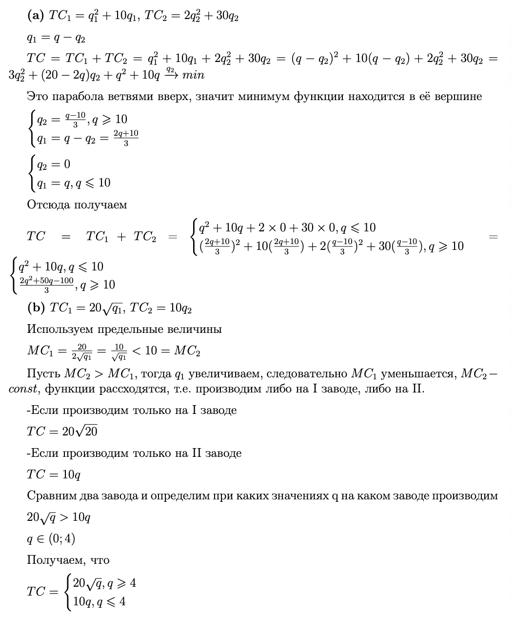 Задачи на «два завода» изучают оптимальное распределение выпуска между несколькими производственными подразделениями с разными издержками. Цель фирмы — произвести заданный общий выпуск с минимальными суммарными издержками, перераспределяя объём между заводами так, чтобы предельные издержки были выровнены (когда это возможно). Этот подход лежит в основе анализа многоцеховых фирм и агрегирования издержек.