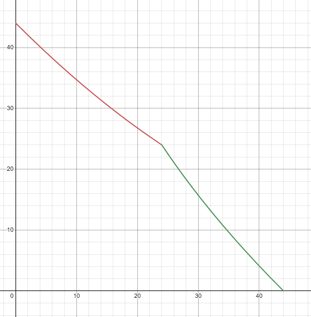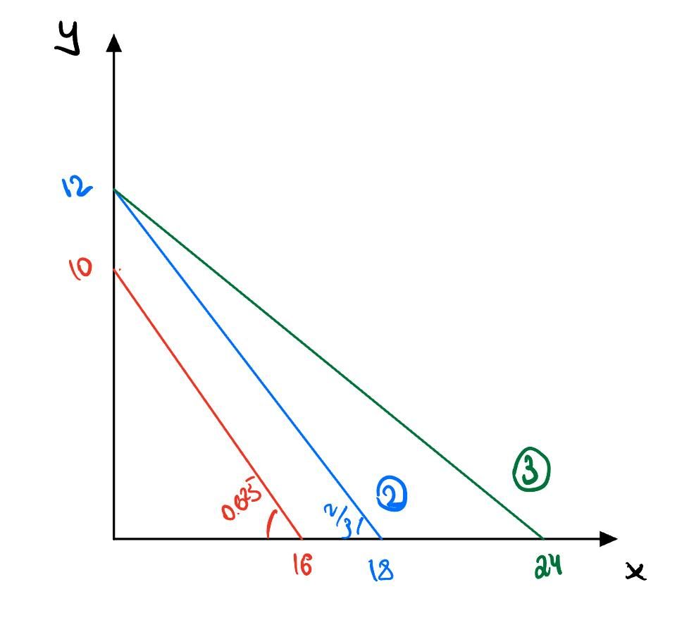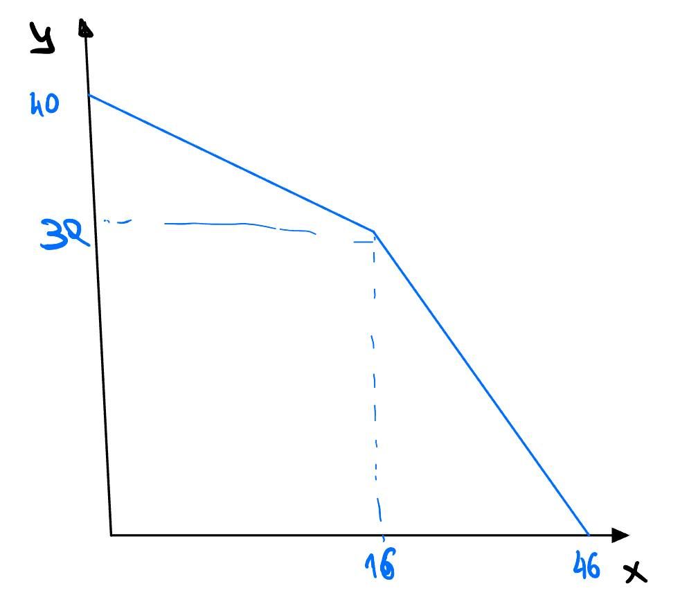 Выпишем ограничения по каждому ресурсу и нарисуем их на графике. Поскольку для производства необходимы все три ресурса, итоговая КПВ будет нижней огибающей.