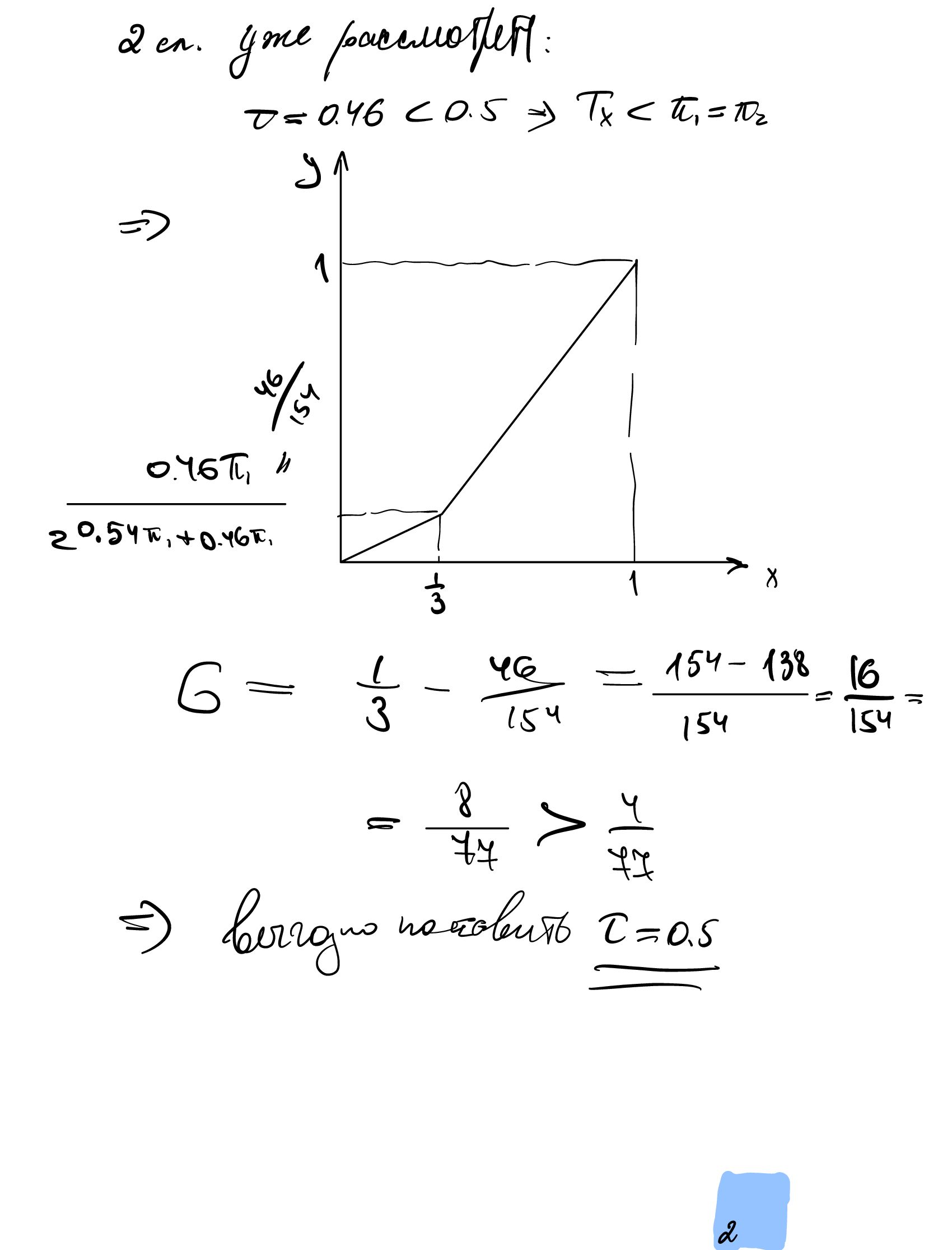 c) Теперь доход государства тоже учитывается. Кривая Лоренца строится так, что фирмы A, B и государство занимают по 1/3 населения. При какой ставке налога уровень неравенства будет минимальным?