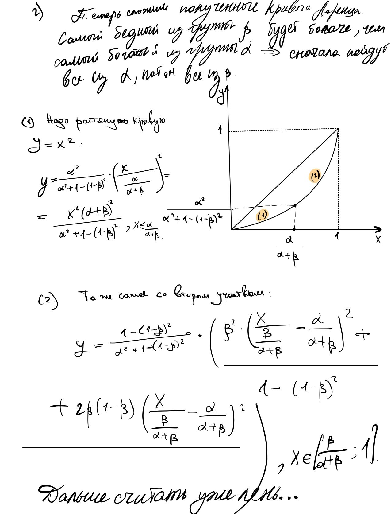 d) Подданные решили оставить и α беднейших, и β богатейших (при этом). Найдите новую кривую Лоренца для оставшихся жителей. Как изменятся индексы Джини и Робин Гуда?